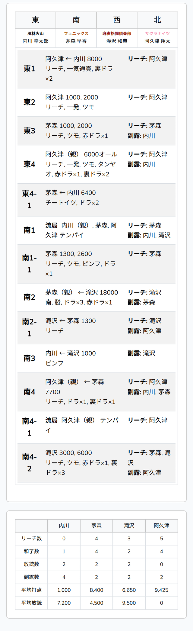 東4局4本場、岡田が七対子のダマテンを入れる。そこに親の永井が[二][五]待ちでリーチ。永井は[①]を暗槓。テンパイの滝沢が[二]を勝負すると永井のアガリ。さらに裏ドラが3枚乗って満貫のアガリとなった。
