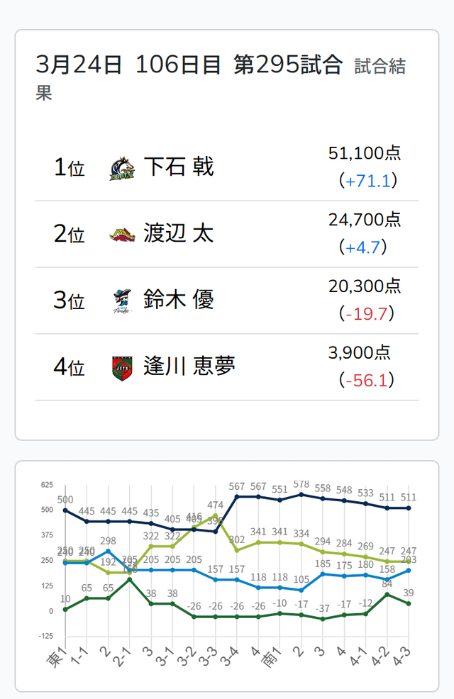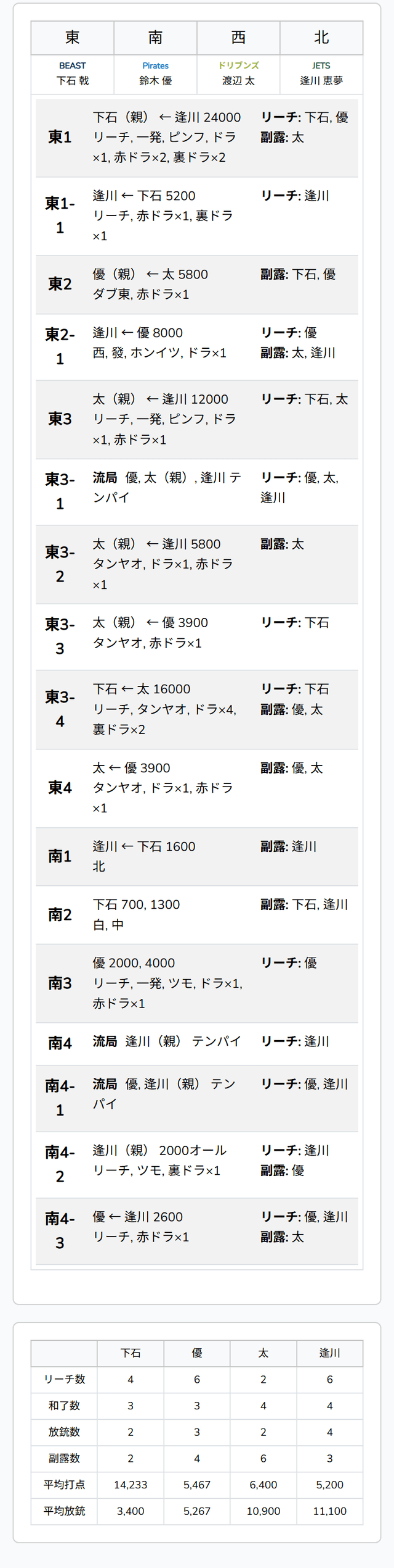 を3枚抱えた下石がファーストテンパイを入れるものの、良形を求めてイーシャンテンに戻す。優が二副露して、トイトイをテンパイ。親の太は終盤、ポンテンを入れて追いついた。太がダイミンカンをし、新ドラが3枚乗ったところで、下石がリーチで攻勢をかける。最後は太がつかんで、下石がロンの声をかけた。裏ドラが2枚乗って16000のアガリ。トップ目が入れ替わる。