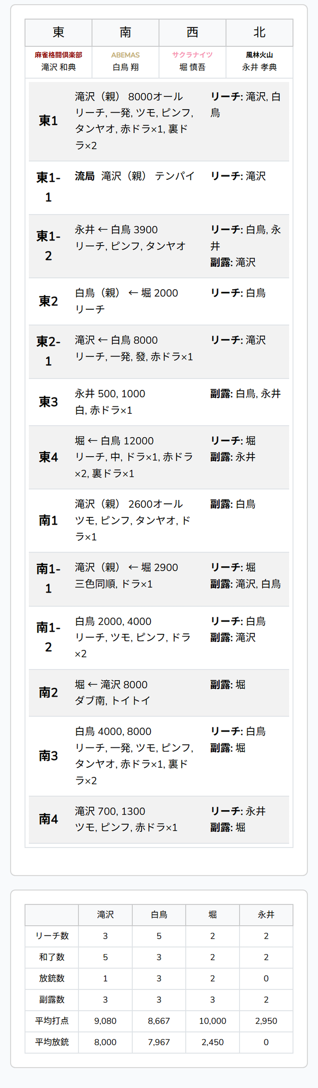 待ちで先制リーチを打つと、間もなく親番滝沢が白鳥のアガリ牌を吸収して![]()