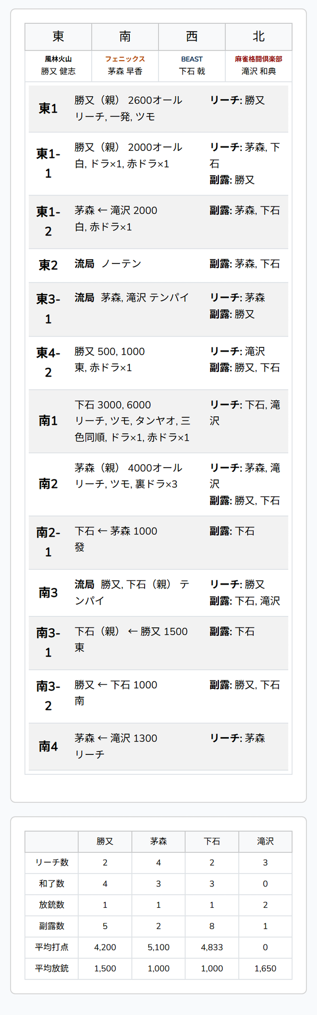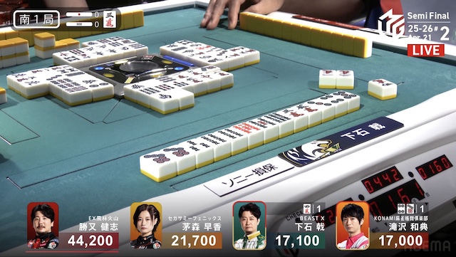 待ちで先制リーチ。4着目の滝沢は、12巡目に門前で追いつくと、追いかけリーチで勝負をかける。山に1枚どうしの二軒リーチのめくり合いは、下石が競り勝ってツモアガリ。3000・6000とした。