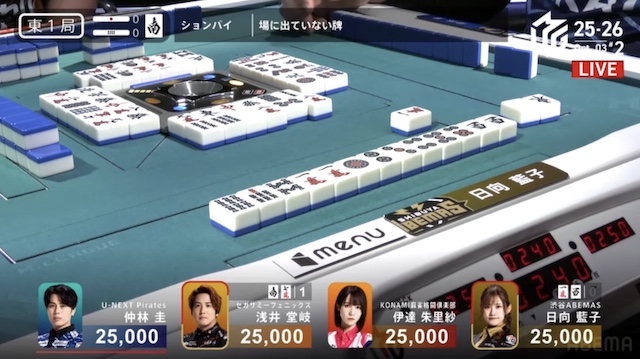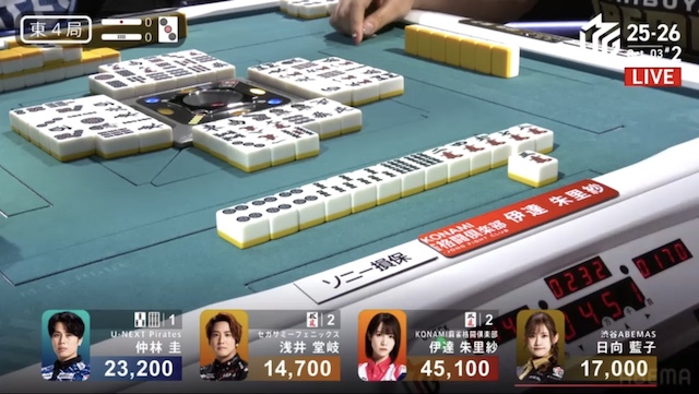 東1局、日向の先制リーチに、堂岐が追いかけリーチで対抗。日向が仲林から打ち取って1300を先取した。