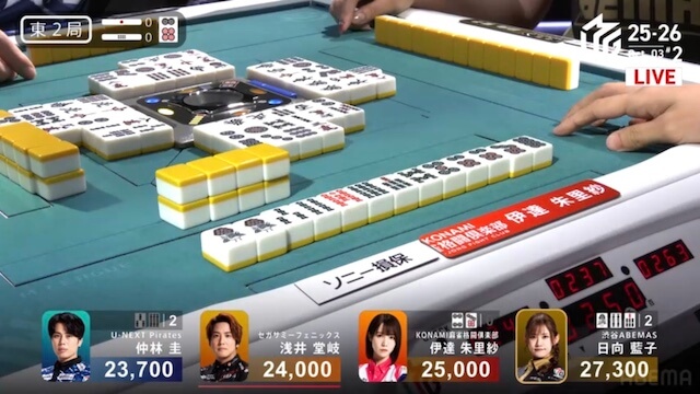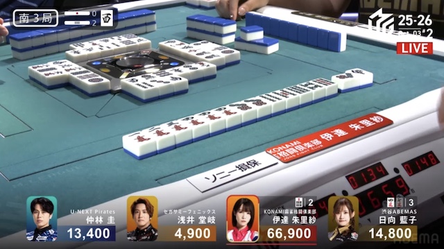 南3局2本場、親の伊達が10巡目に先制リーチ。仲林からロンアガリ。2000は2600を加点し、さらなる連荘に成功する。