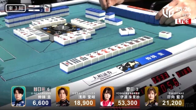 東3局、伊達・堂岐ともに仕掛けてテンパイを入れる。さらに日向が二副露目を入れてテンパイ。三軒テンパイで流局となった。続く東3局1本場は、親の伊達が仕掛けを入れる中、ドラ3枚・赤1枚を使った仲林が、9巡目に先制リーチ。タンヤオとイーペーコーがつく高めのをツモアガリ。4000・8000は4100・8100のアガリを決めて、一躍2着目に浮上した。