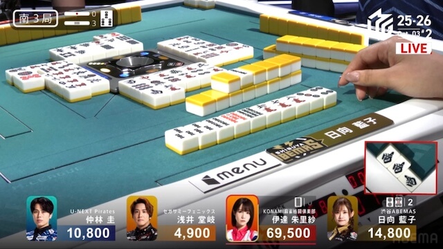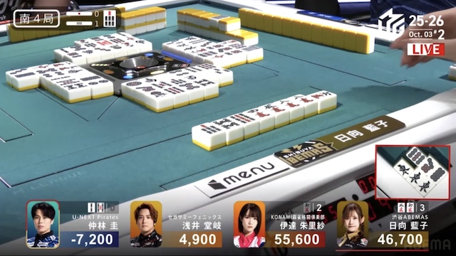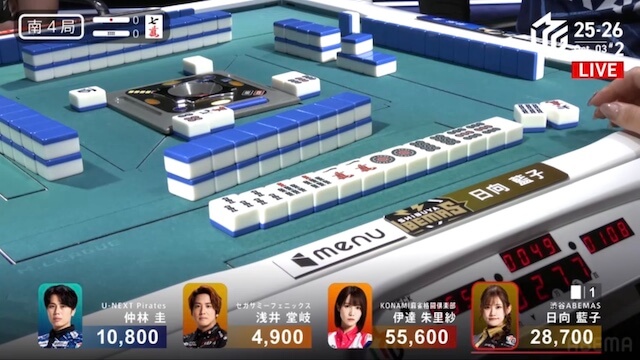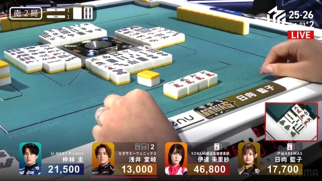 南4局、親の日向が2巡目にチートイツで先制リーチをかけると、仲林から一発でロンアガリ。裏ドラを2枚乗せて18000を加点した。