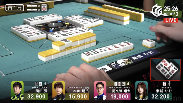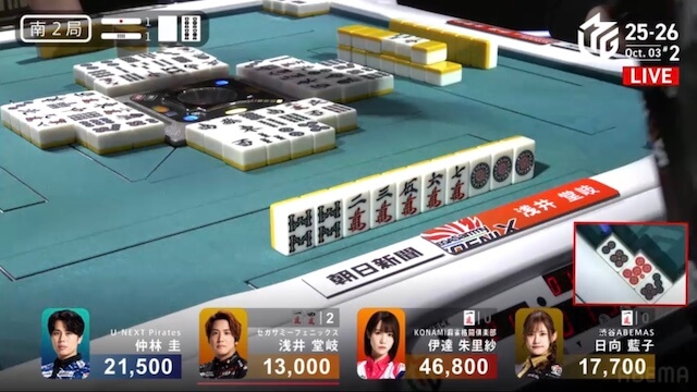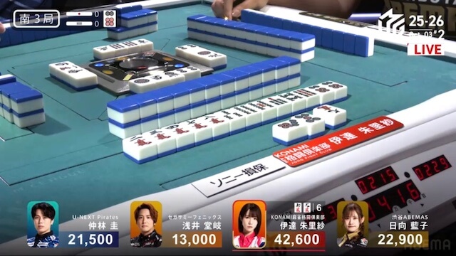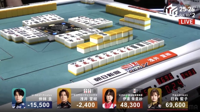 に、親の堂岐と仕掛けていた日向のロンの声が重なった。頭ハネで日向のアガリ。3900は4200となった。