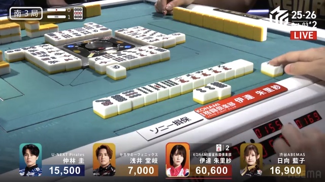 南4局1本場、トップ目の伊達と2着目の親番・日向の点差は8900点。日向が自風のをポンして前に出る。