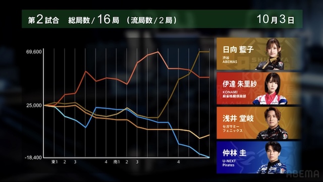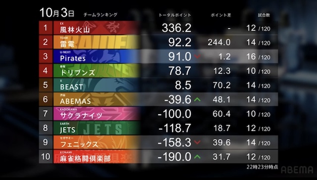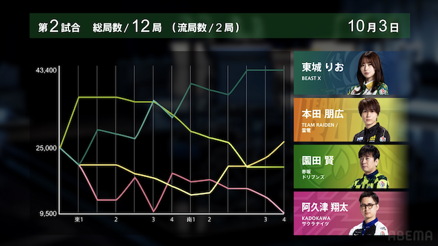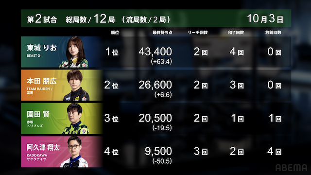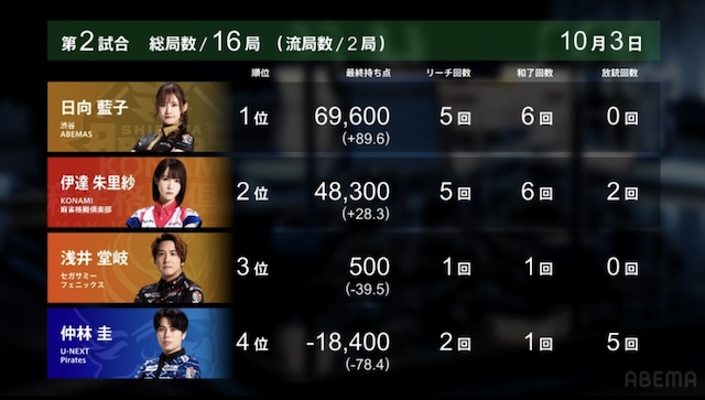 ABEMASが日向の大きなトップで大きく加点、マイナス40ポイントまで復活しあと1トップでプラス圏まで戻って来た。麻雀格闘倶楽部はあと一歩で初勝利という所だったが伊達が悔しい2着落ちに。しかしまだまだ前向きに戦って行きたい。