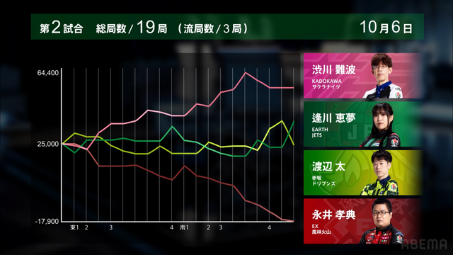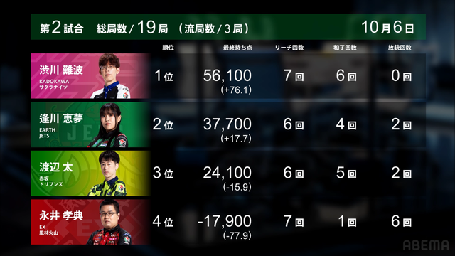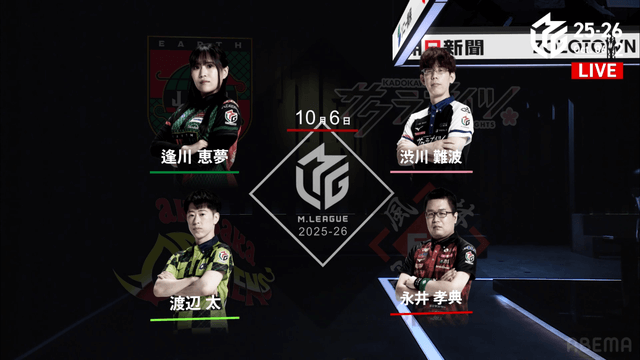 【10/6 Mリーグ2025-26 第2試合結果】親番で加点を重ねた渋川難波がトップを獲得!逢川恵夢はオーラスで条件を満たす大物手で2着浮上に成功!