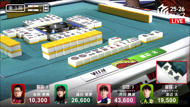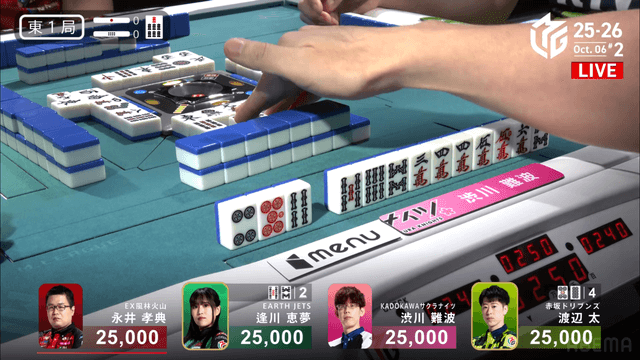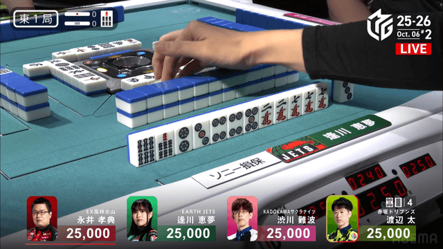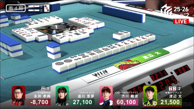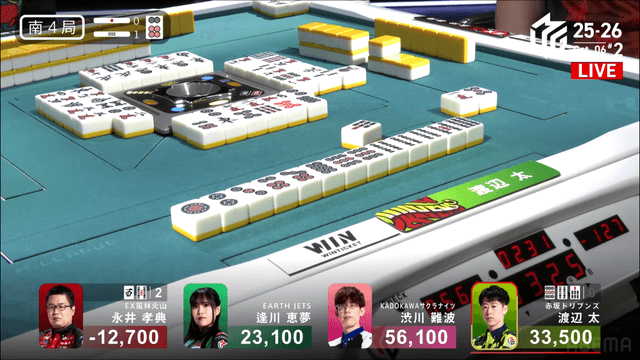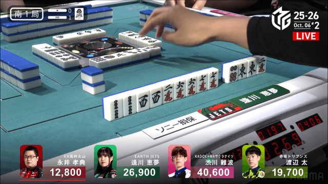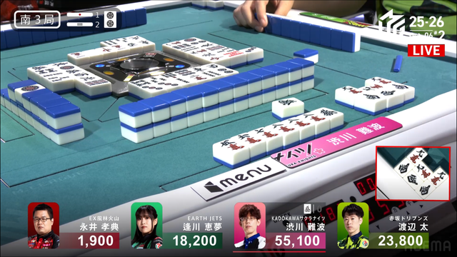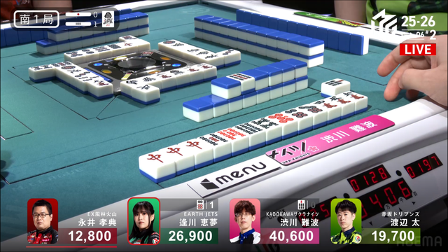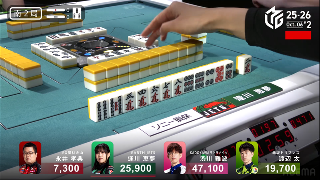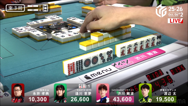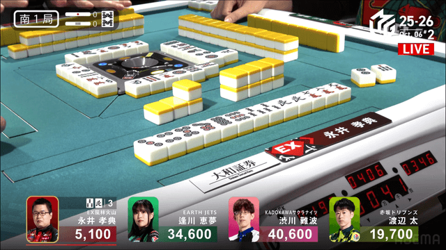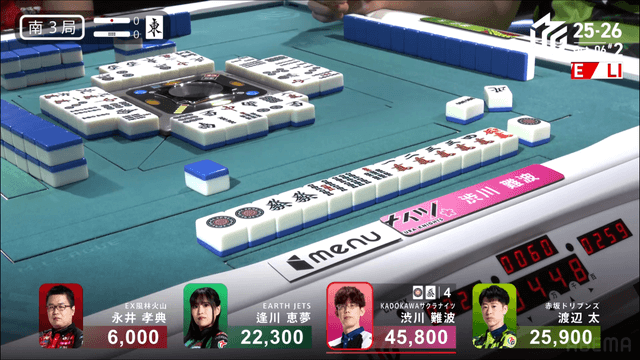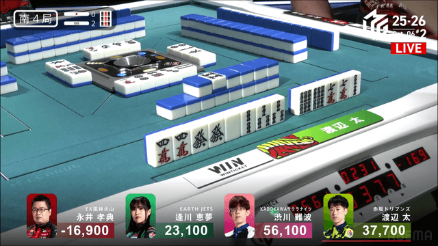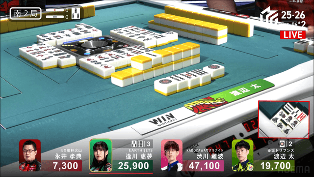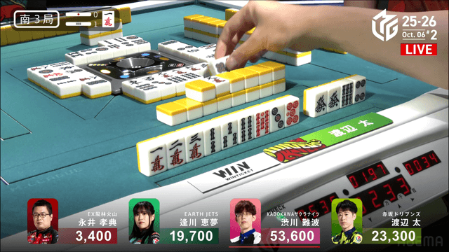 南3局 親番渋川が[①][発]のシャンポン待ちで先制リーチをかける。永井と逢川が着順上昇を狙った高打点の見える手だったが、渋川が[①]をツモ、2600オールのアガリで渋川の持ち点は50000点を超える。
