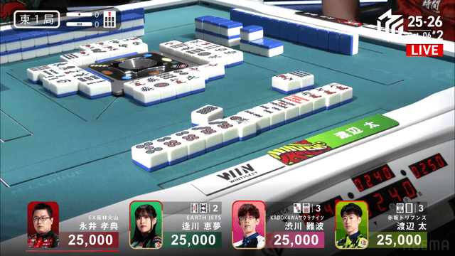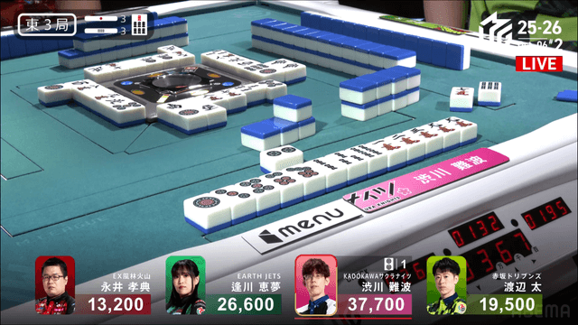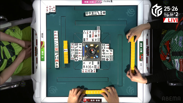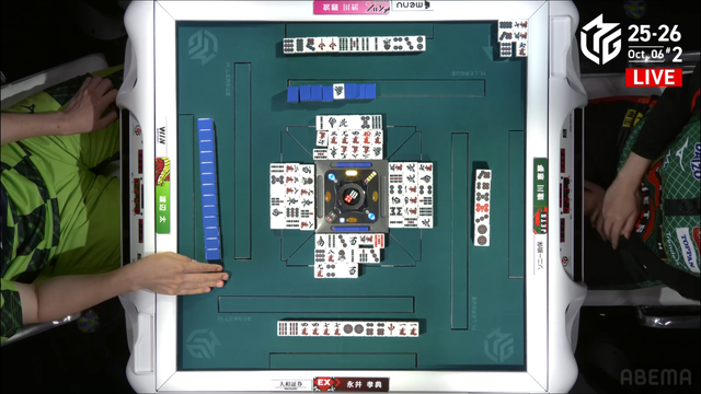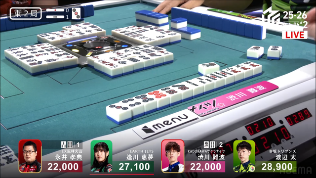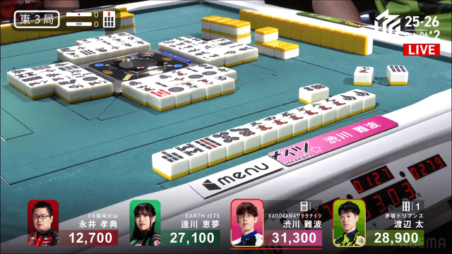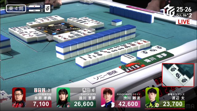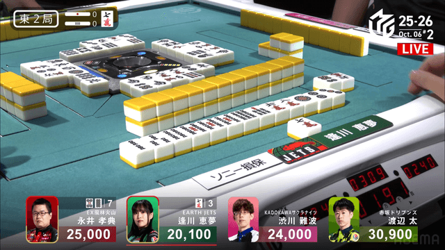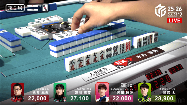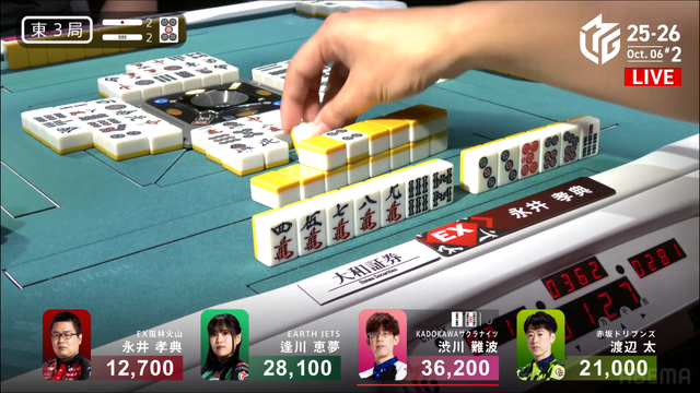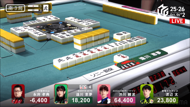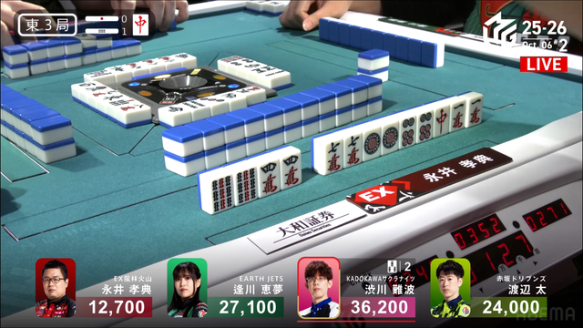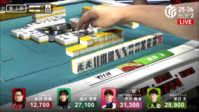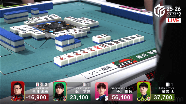 東3局2本場 逢川が[東]、親番渋川が[二]をポンからアガリに向かう。終盤に渋川が[2][5]待ちでテンパイ、ここに永井が[三][六]待ちリーチで追いつく。アガリは出ず、渋川と永井の2人テンパイで流局した。