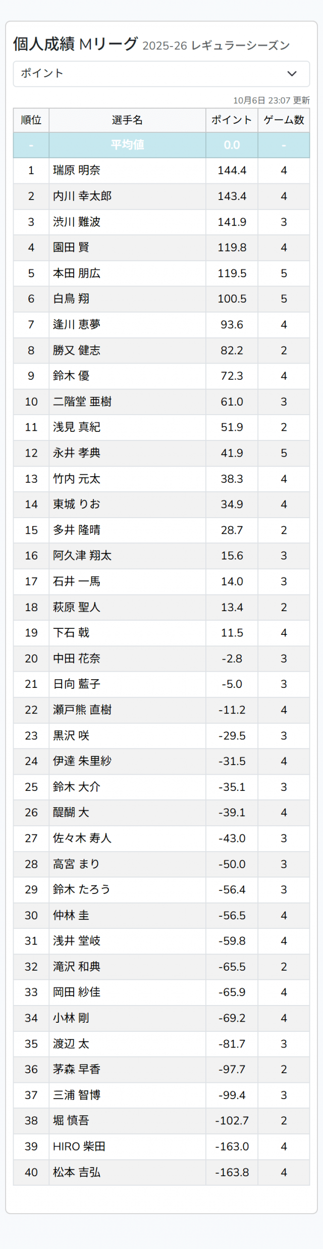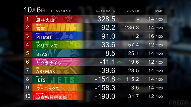 麻雀プロリーグ「大和証券Mリーグ2025-26」レギュラーシーズン13日目が10月6日(月)に開催された。
