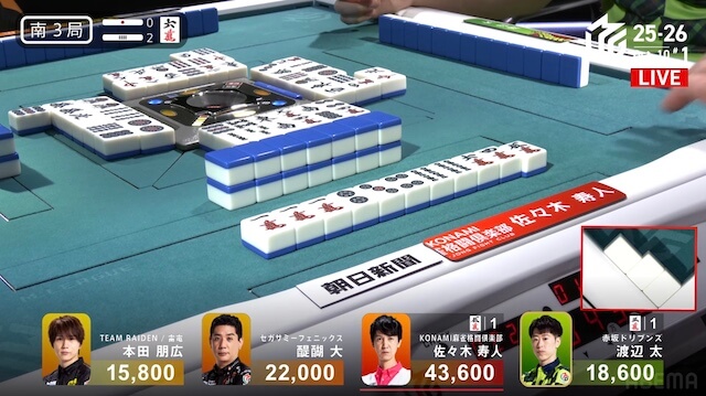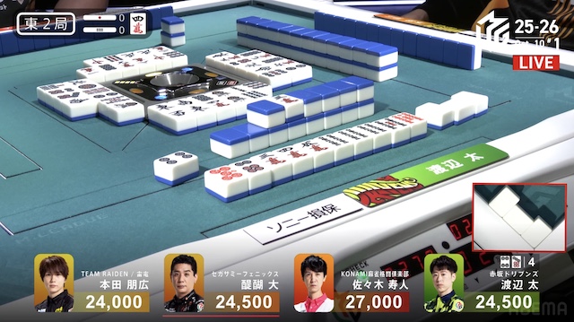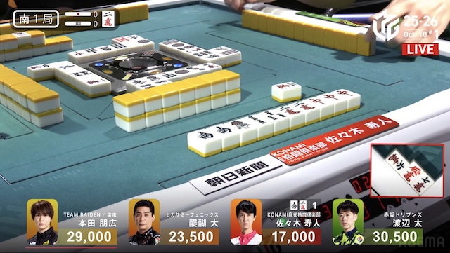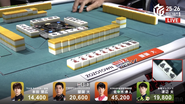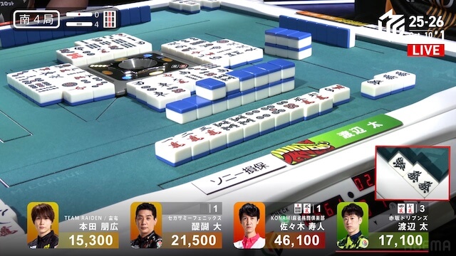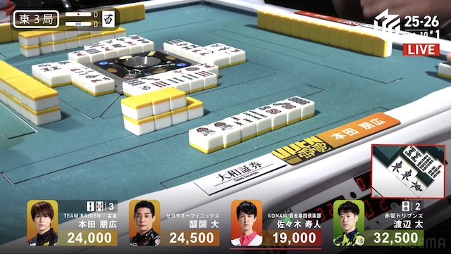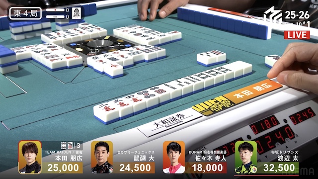 東4局、本田が待ちで先制リーチ。これが山に3枚あり、ツモアガリ。裏ドラを1枚乗せて、1000・2000を手にし、トップ目の太まで1500点差に迫って南入する。