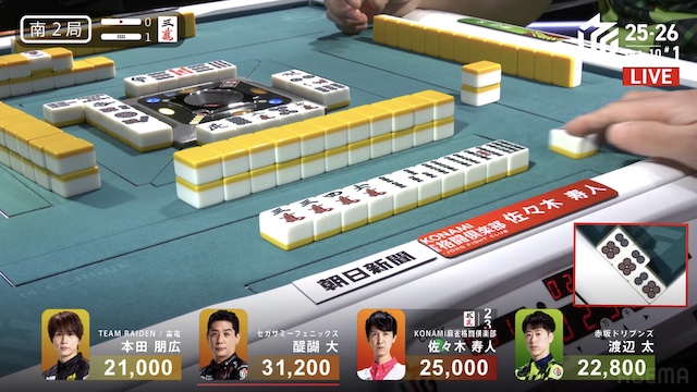 南3局2本場、連荘中の寿人が仕掛けて待ちのテンパイを入れる中、そのアガリ牌である
