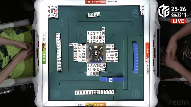 東3局、太がを仕掛けてテンパイ。本田は二副露してテンパイ。二軒テンパイのめくり合いは、寿人のリーチ宣言牌をとらえた本田に軍配が上がった。
