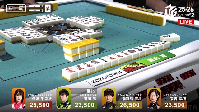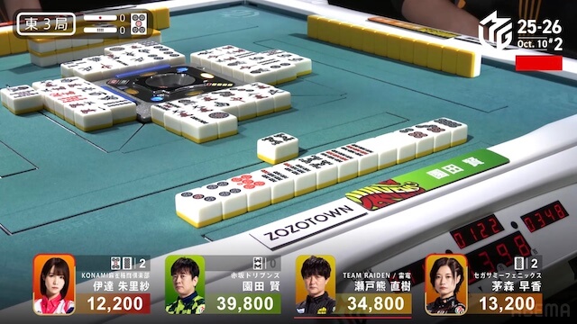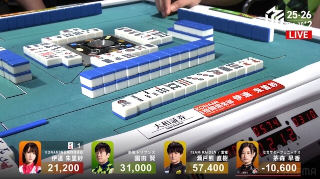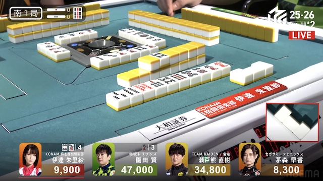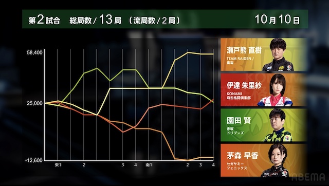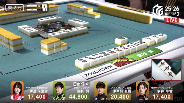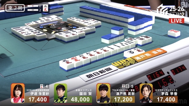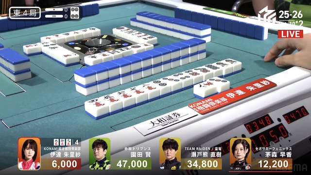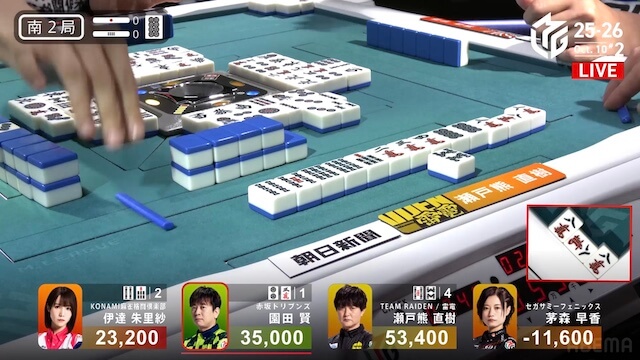東2局、親の園田が7巡目に待ちの先制リーチ。瀬戸熊は追いついたが、ダマテンに構えて息を潜め、危険牌を引いて迂回した。園田は山に5枚あった待ち牌を、悠々とツモアガリ。4000オールで連荘に成功した。