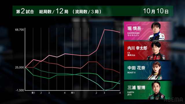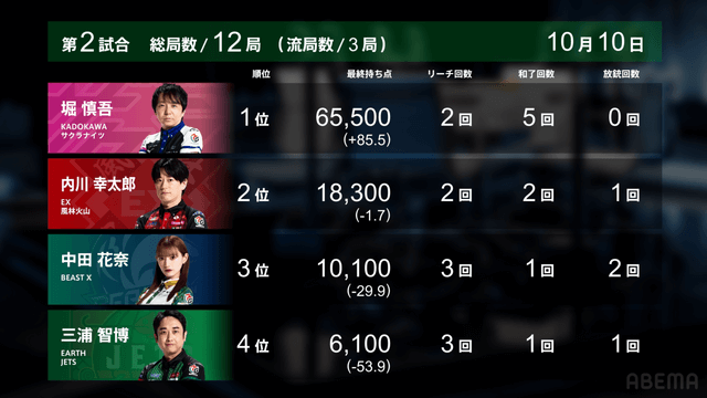堀がトップ目から南3局で8000オールをツモアガリ。大きくリードを広げて試合を決めた。