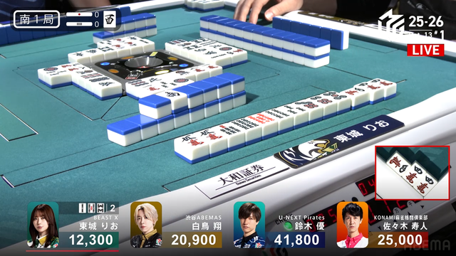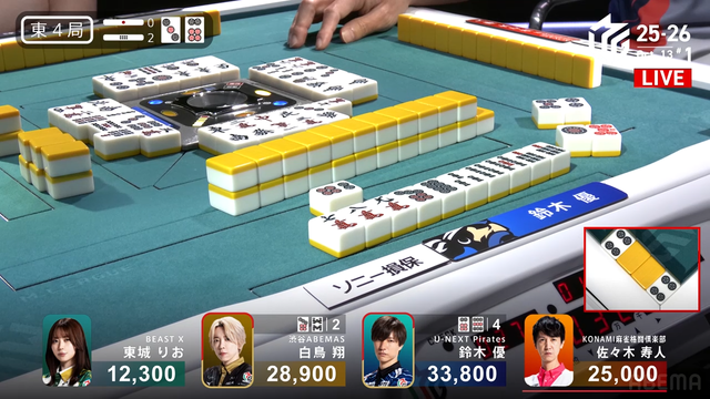東3局、親の優が赤2のペン待ちで先制リーチ。仕掛けていた白鳥から