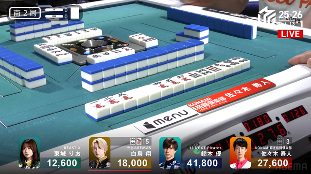 南4局1本場、白鳥が先制テンパイをダマテンに受ける。そこに親の寿人が待ちでリーチ。さらに仕掛けた優とリーチの東城は共に