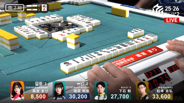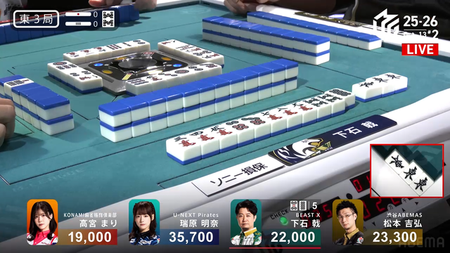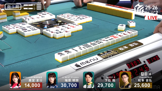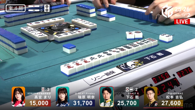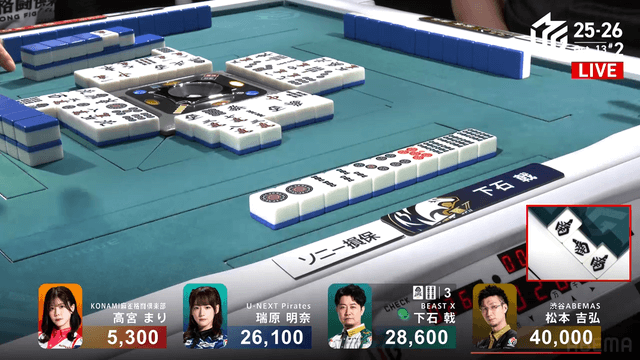 南4局、仕掛けていた下石が待ちで先制テンパイ。結果は瑞原から