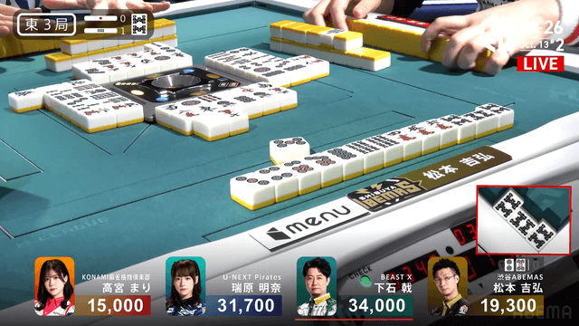 東2局1本場、松本が仕掛けて待ちでテンパイ。そこに親の瑞原が