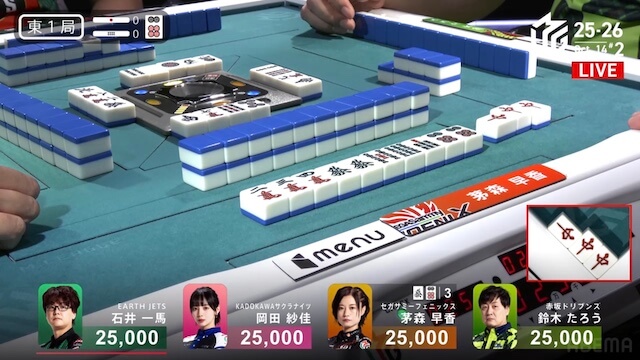 南3局、3着目の茅森が親番。たろうがオタ風のを、茅森が場風の