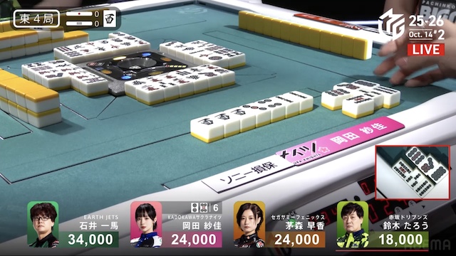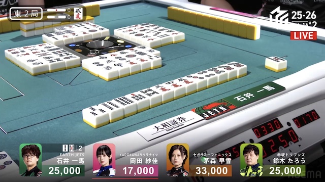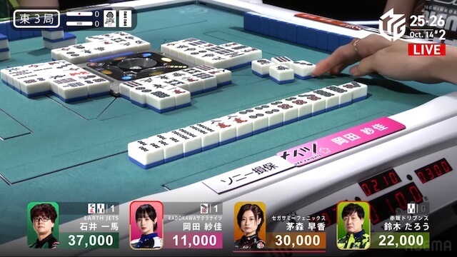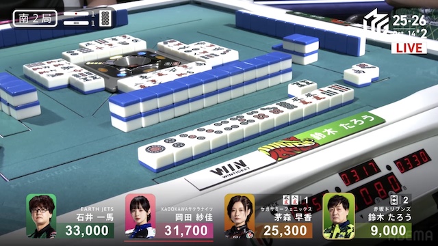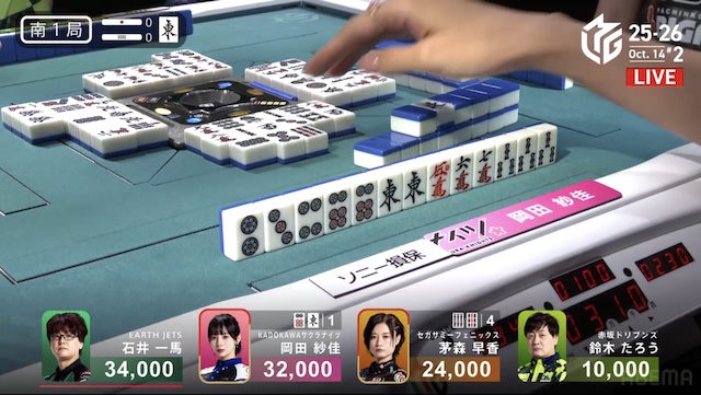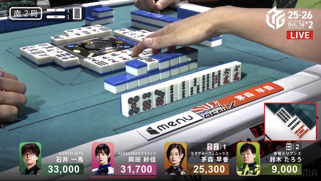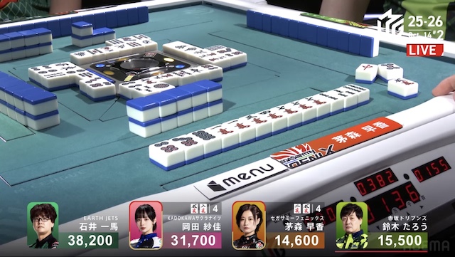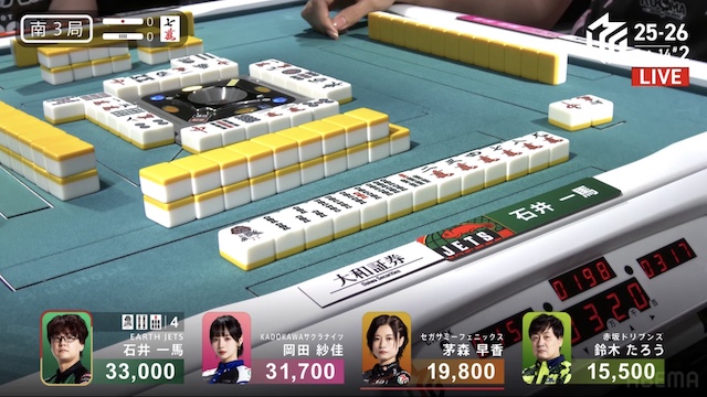 待ちの追いかけリーチで対抗。岡田は6500点上でトップ目の一馬を追いかける。岡田のアガリならトップ目と2着目が、茅森のアガリなら3着目と4着目が、それぞれ入れ替わるところだったが、最後は茅森がツモアガリ。1000・2000で3着になり、試合終了となった。