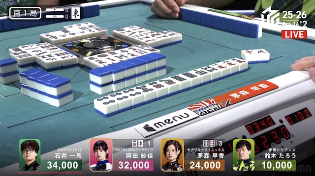 南2局、親の岡田が10巡目に先制リーチしたが、子方が丁寧に受けて一軒テンパイで流局。続く1本場、供託が1本ある。仕掛けた茅森がテンパイを入れた同巡、たろうがテンパイを入れると即リーチ。2人テンパイのめくり合いは、茅森がをつかんで、たろうがロンアガリ。5200となった。