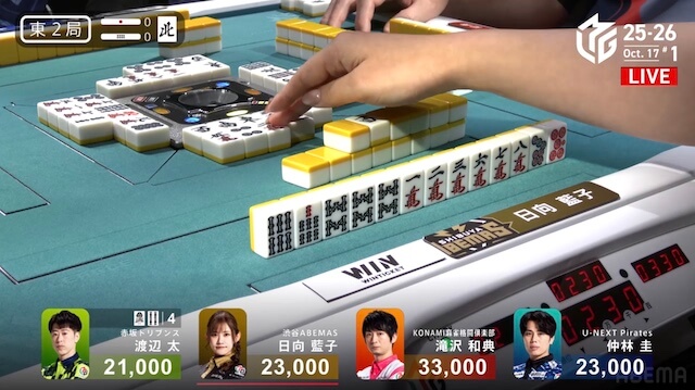 ポンで対抗。日向のリーチ宣言牌をとらえて8000とした。