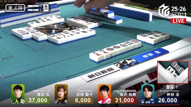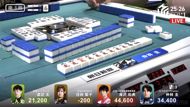 南4局、トップ目で親の仲林が仕掛けてテンパイを入れている中、3着目の太にもテンパイが入り、リーチに踏み切った。さらに滝沢もリーチをかけると、仲林は迂回。トップ目の仲林と2着目の滝沢はテンパイ・ノーテンでも逆転する点差だったが、最後は太がツモアガリ。3000・6000で、太の着順は変わらないものの、トップが滝沢、2着に仲林となって終局した。
