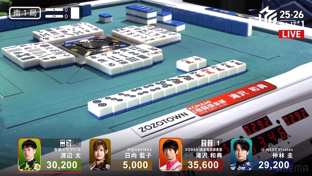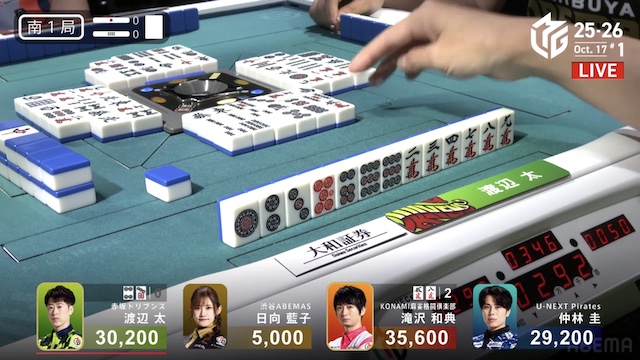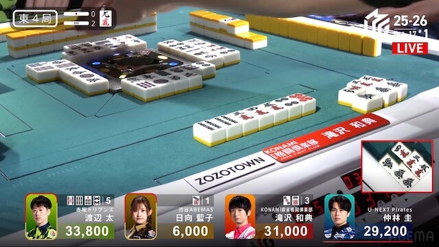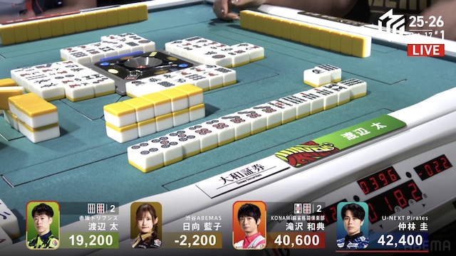 待ちで追いかけリーチに踏み切った直後、二副露目を入れた滝沢もテンパイ。最後は太が滝沢のアガリ牌をつかんで、滝沢がロンアガリ。2000は2600にリーチ棒2本も手に入れて、トップ目に立った。