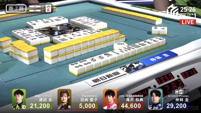 南2局、仲林が先制リーチ。日向から高めのをとらえ、裏ドラも1枚乗せ、5200を加点する。日向は苦しい箱下へ。