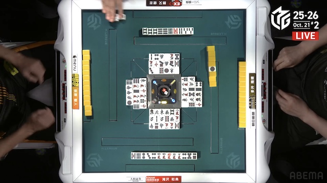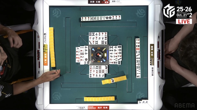 南4局、トップ目の滝沢がチートイツのテンパイを入れる中、3着目で親の萩原が先制リーチ。2着目の勝又も追いかけリーチで対抗する。二軒リーチに対し、滝沢はテンパイを崩した。二軒テンパイで流局。