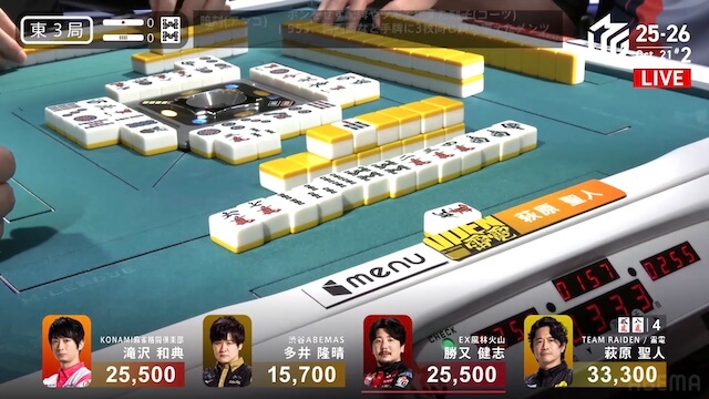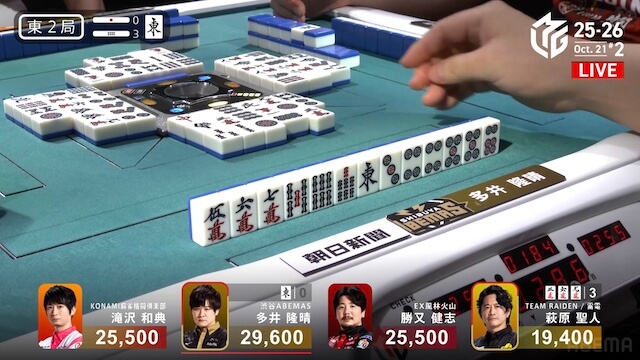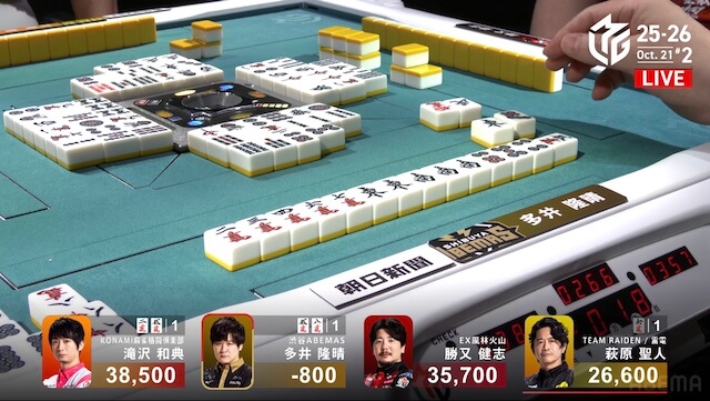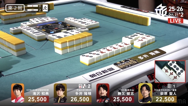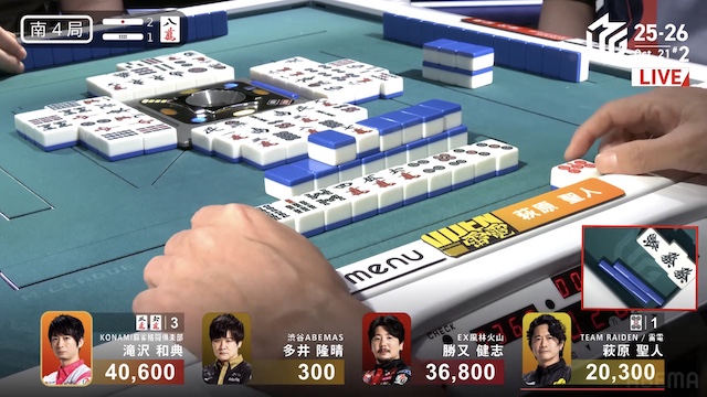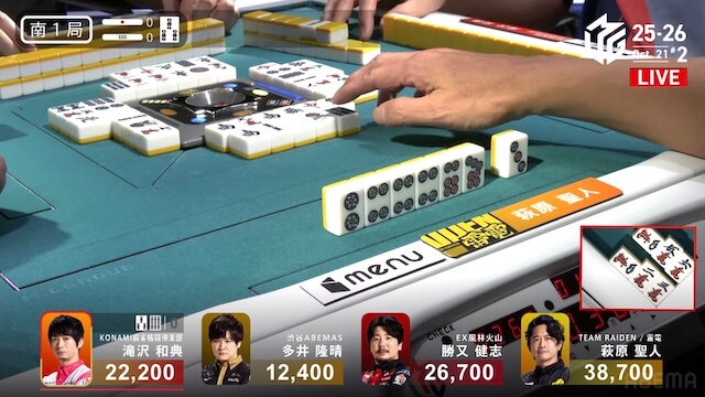 東2局3本場、萩原と多井が二軒リーチのめくり合いになったが、多井のアガリ牌は山になく、萩原のアガリ牌をつかんで、萩原がロンアガリ。12000となった。