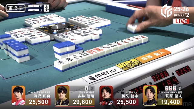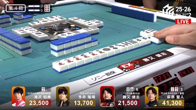 南3局、多井が5巡目に先制リーチ。親の勝又が押し返し、13巡目に追いかけリーチ。ツモアガリで4000オールを手にした。