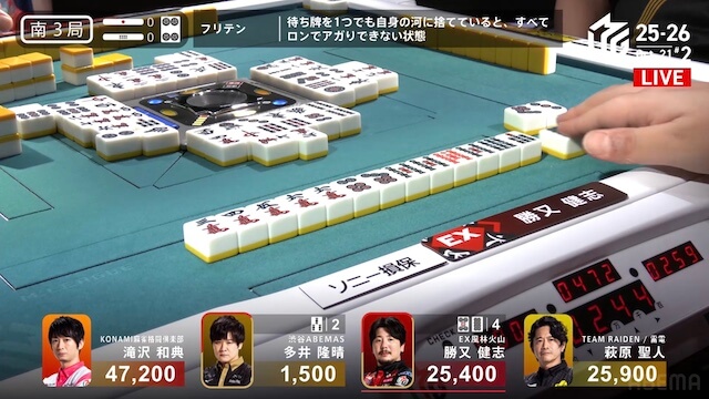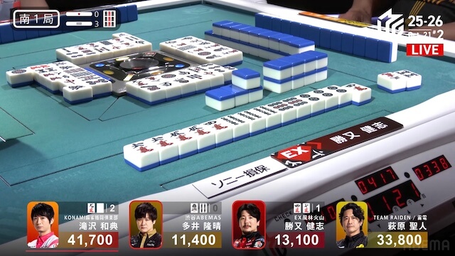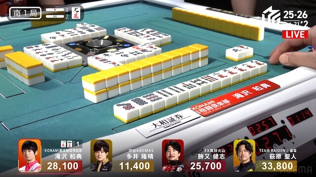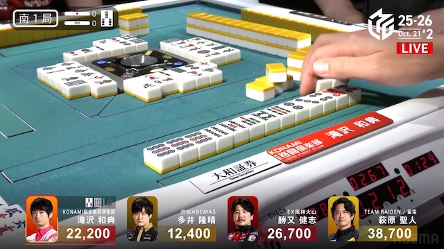 南1局1本場、親の滝沢が待ちの三面張で先制リーチ。しかし子方が丁寧に受けて、一軒テンパイで流局。続く南1局2本場、供託が1本ある。親の滝沢が6巡目に789の三色同順確定の先制リーチ。勝又のテンパイ打牌をとらえて12000は12600とした。