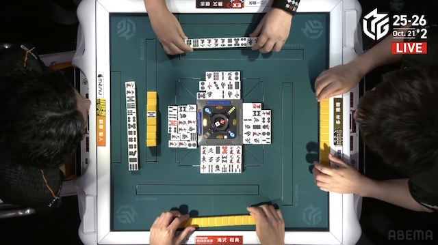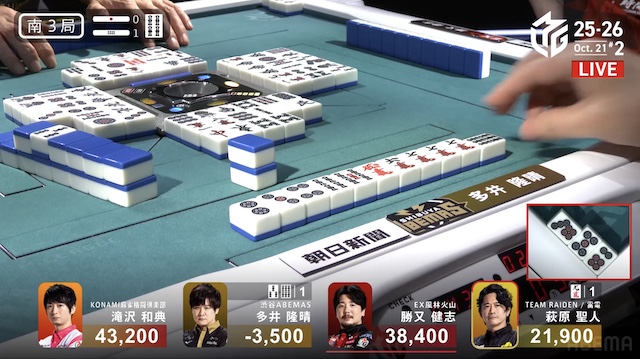 南2局、トップ目の滝沢がカン待ちでファーストテンパイ。多井が追いついて
