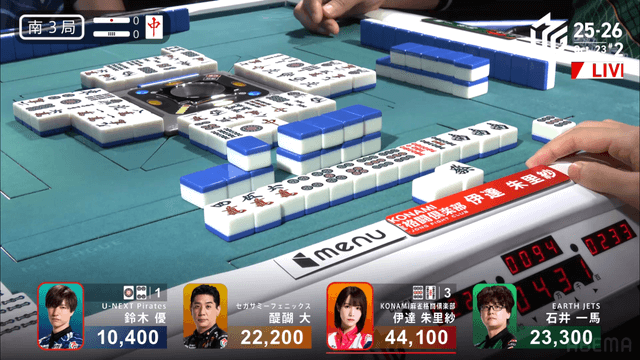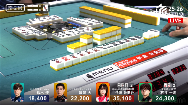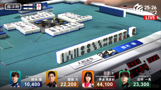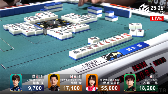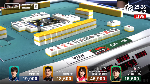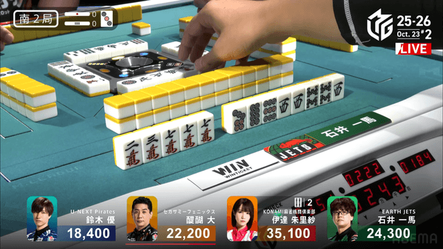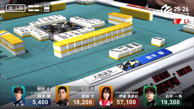 をツモぎり優がロン、裏ドラ1枚で2着の一馬までまくるという状況だったが裏ドラは乗らず4500のアガリ、3着までとなる。このアガリにより伊達が今シーズン初トップを獲得した。