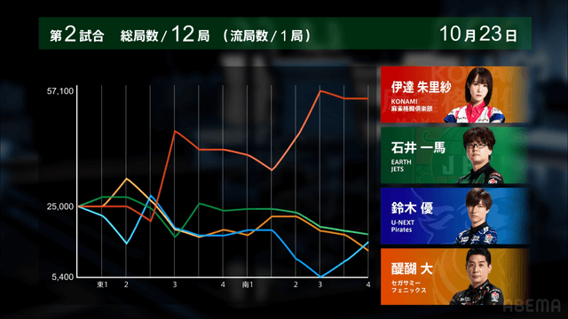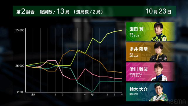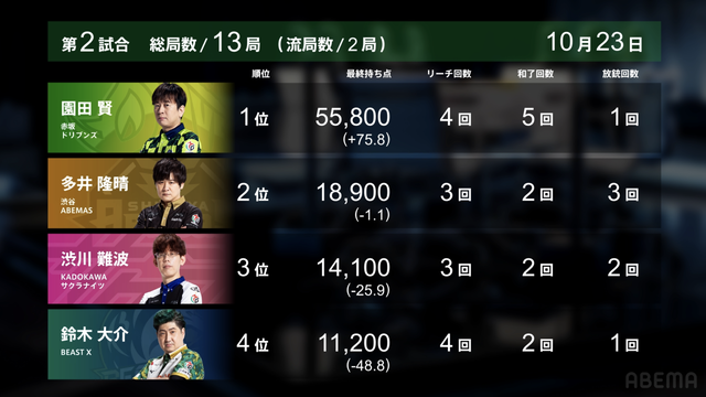 が打ち出される。園田が12000は12300のアガリで多井に並ぶ。