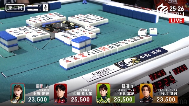 に待ち変えをして追いかけリーチ。しかしアガリは生まれず、二軒テンパイで流局となった。続く東2局1本場、浅見が11巡目に先制リーチ。しかし中田が15巡目に追いかけリーチを放つと、浅見がつかんだ