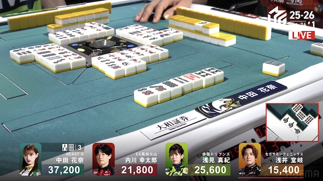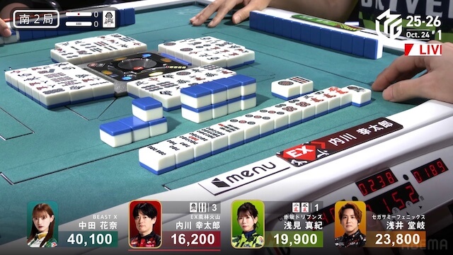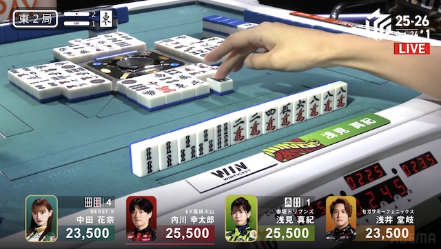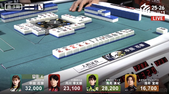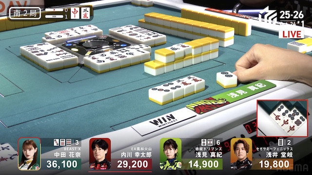 南2局、浅見が13巡目に先制リーチ。内川が16巡目に追いかけリーチで対抗する。内川はハイテイでドラの