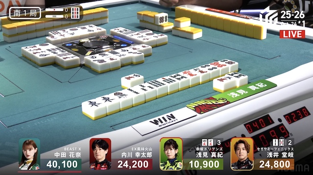 南2局1本場、内川が仕掛けてファーストテンパイを入れ、さらなる連荘に意欲を見せる。浅見がドラの