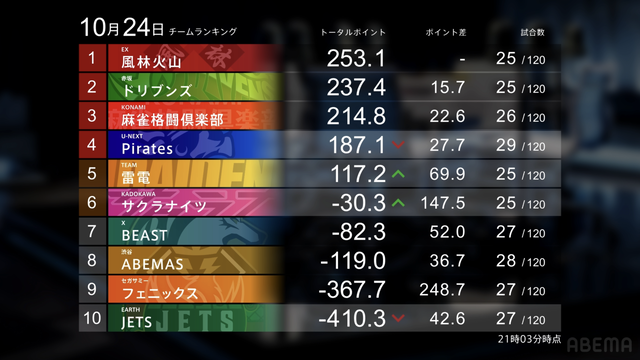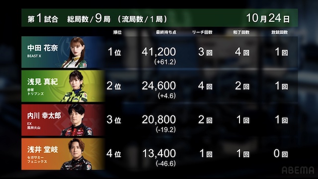 麻雀プロリーグ「大和証券Mリーグ2025-26」レギュラーシーズン24日目が10月24日(金)に開催された。