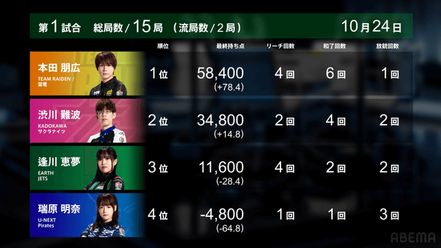 本田が東2局の親番で瑞原から18000を打ち取り、そのままトップでゴールした。
