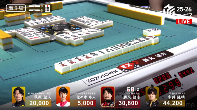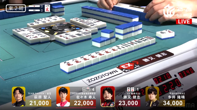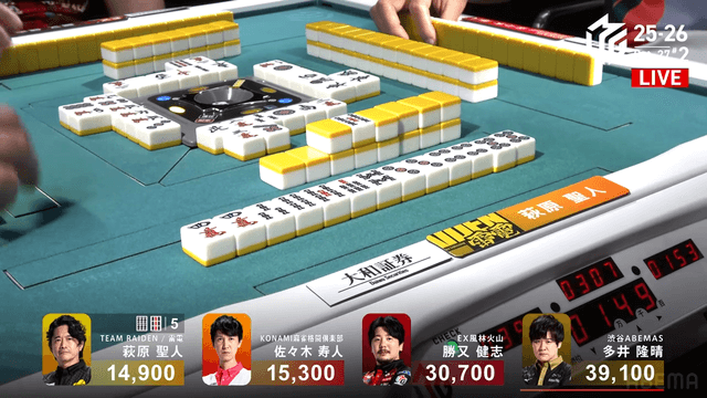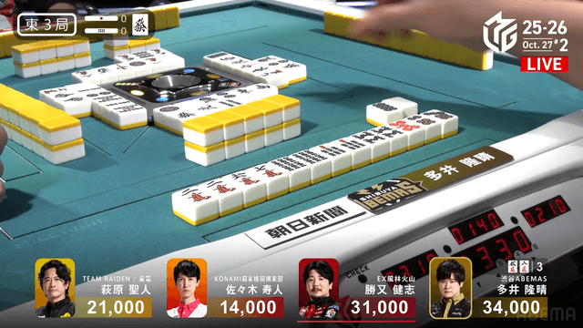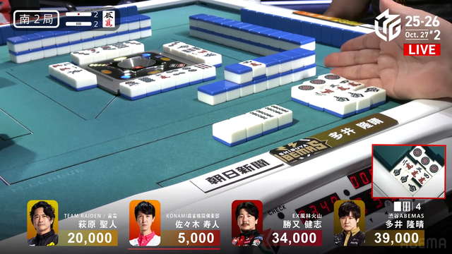 待ちで先制リーチ。そこに仕掛けていた親の萩原が追いつく。さらに寿人が追いついてリーチをするが、結果は多井が