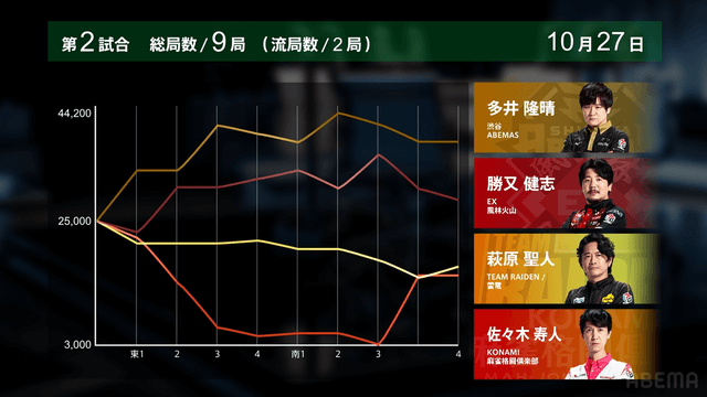 10月は毎年調子が良いとされている多井が更なる加点を決めてABEMASはマイナスポイントを2桁まで戻して一歩前進。