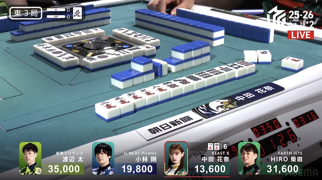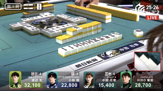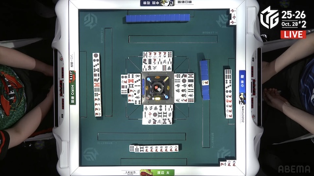 待ちで追いつくが、フリテンになっており、出アガリができない。中田はツモアガリすると、裏ドラを1つ乗せて2600オールを加点。2着目に浮上する。