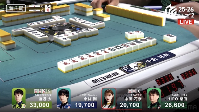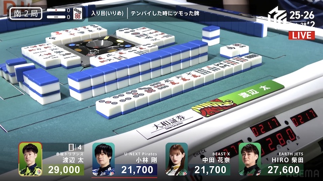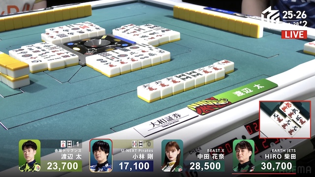 を仕掛けている中田も、危険牌を押してテンパイ。中田がツモアガリで、1000・2000は1100・2100を手にし、小林と並んで3着目に浮上した。