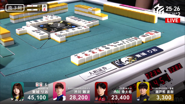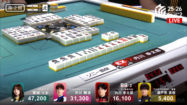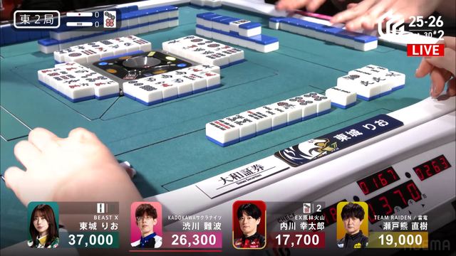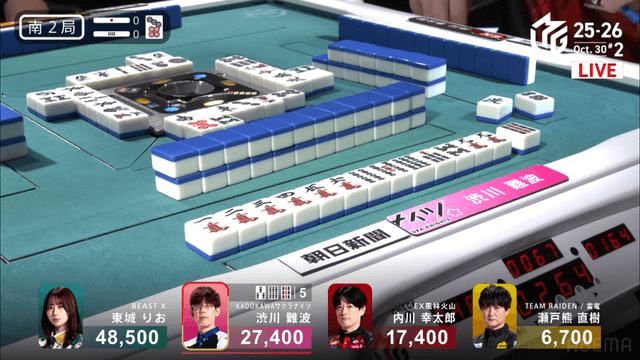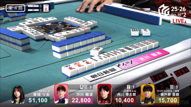 を捕らえる。渋川が2000は2300のアガリ、供託リーチ棒3本も嬉しい加点となった。