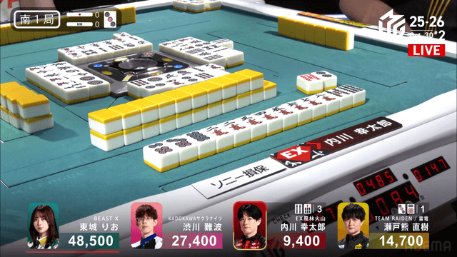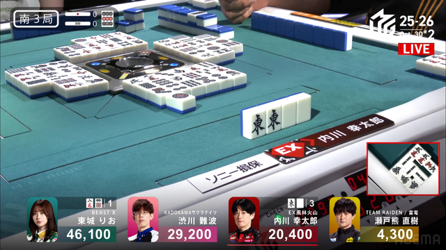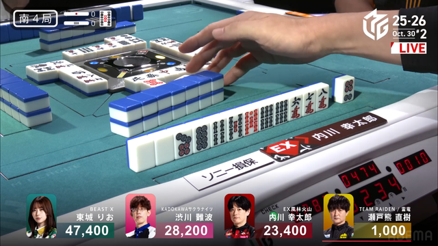 南4局 内川が着順上昇のための打点条件を満たした![]()