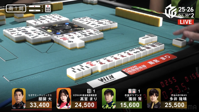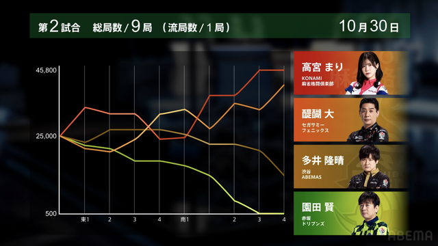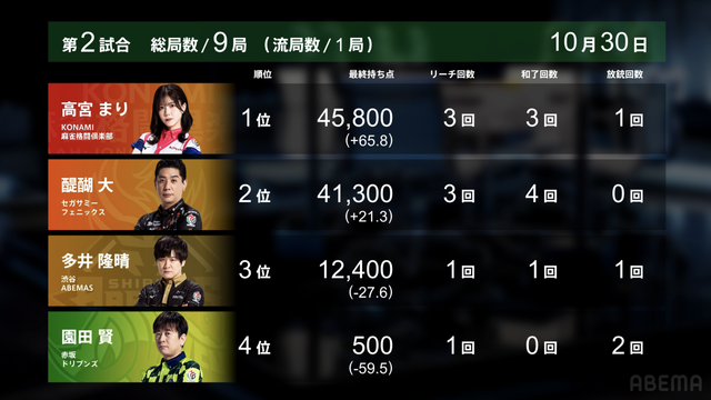 東1局から満貫のアガリで先制の加点を決めた高宮、途中で醍醐に8000の放銃もあったが、南場でダブルリーチのアガリ、次いで裏3のアガリと猛攻を見せ、トップを獲得した。